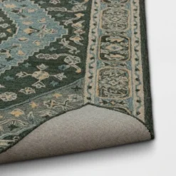 Add a touch of class and comfort to your decor with the Hand-Tufted Wool Area Rug from Threshold™. Made of 100% wool with a cotton-blend backing, this handmade area rug has a large diamond medallion in the center in teal blue, dark green, yellow and cream shades. A coordinating border completes this statement piece and gives your room a striking appearance. This hand-tufted rug will make a charming addition to your space whether you use it in your living room, entryway or home office, and it’s also super easy to clean thanks to its low pile height.