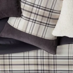 Freshen up your bedroom oasis with the timeless style of the Conway Comforter Set from Threshold™. Made from a woven fabric, this multi-piece bedding set includes everything you need to transform your bedroom into a cozy haven that provides year-round comfort — simply add your choice of sheets. The comforter is adorned with lovely plaids in white, brown and gray shades at the center, and is flanked by corduroy-like textured fabric borders to add a cozy feel to your space. The solid reverse adds elegant style, and the two matching plaid shams and two solid shams complete the plaid comforter set with a coordinated look. It also has two decorative pillows in white sherpa and dark corduroy-like fabric, as well as a solid bed skirt, to provide the perfect finishing touch to your bedscape.