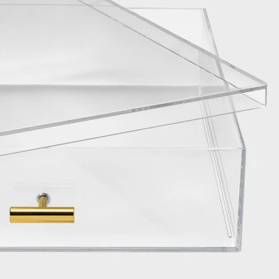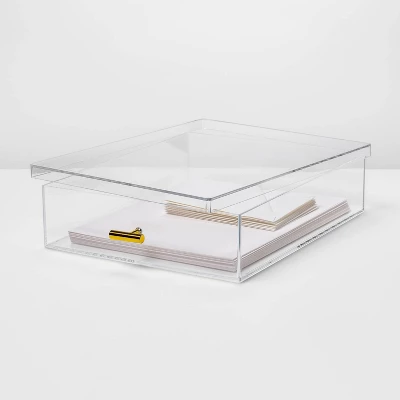 You’ll love keeping your papers and other supplies organized with this Acrylic Letter Size Box from Threshold™. This box features an easy see-through design to help you identify your contents, and the acrylic construction lends sleek flair. Complete with a lid, this letter size box helps keep dust and debris out while keeping your space nice and neat.