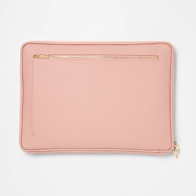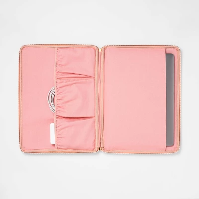 Organize your everyday gadgets and electronic accessories with the Large Tech Storage Pouch from Threshold™. This large tech storage pouch features a main zippered compartment that opens to reveal a tab sleeve and three small pockets to help you neatly store anything from USB cables, flash drives and earbuds to power banks and more. Easy to carry in hand or in your purse or backpack, the design features an exterior zip pocket that offers you additional storage space. Featuring a faux-leather design in pink with gold-tone zippers, it’s sure to add cool style and simple to your daily tech device use.