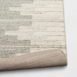 This Modern Lines Area Rug from Threshold™ will create a wonderful foundation in any room. The area rug is adorned with cream bar-chart-like stripes on the two sides with a light gray textured center to add a touch of modern elegance to your space. This rectangular rug has a loomed, medium-pile construction that provides soft comfort underfoot while adding warmth to hard flooring like tile, and it suits both transitional and modern decors.