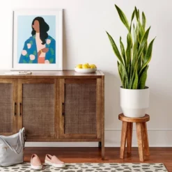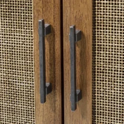 Give your entertainment area stylish, functional flair with this Warwick 3-Door Media Cabinet from Threshold™. Featuring a durable hardwood frame and standing atop a distinct trestle base with four legs, this compact TV unit strikes a clean-lined silhouette and boasts a neutral painted finish for a look that complements a variety of design aesthetics and color palettes. Designed to hold a 29-inch flat-screen TV, it features three doors that open to reveal spacious, adjustable shelves, plus a cord management system for clutter-free and neat organization. The doors are adorned with mesh-detailed fronts for eye-catching appeal, and they have sleek black metal pulls for easy opening and closing.